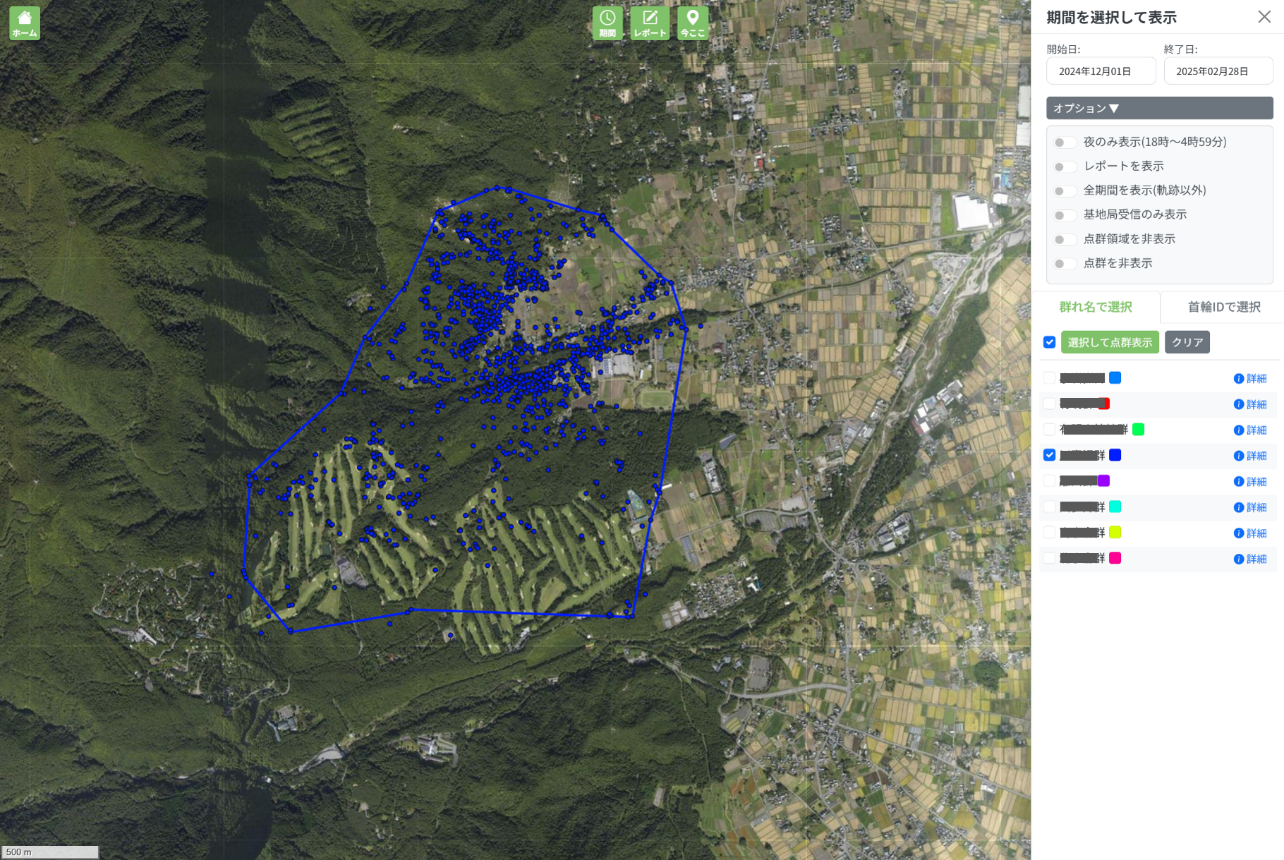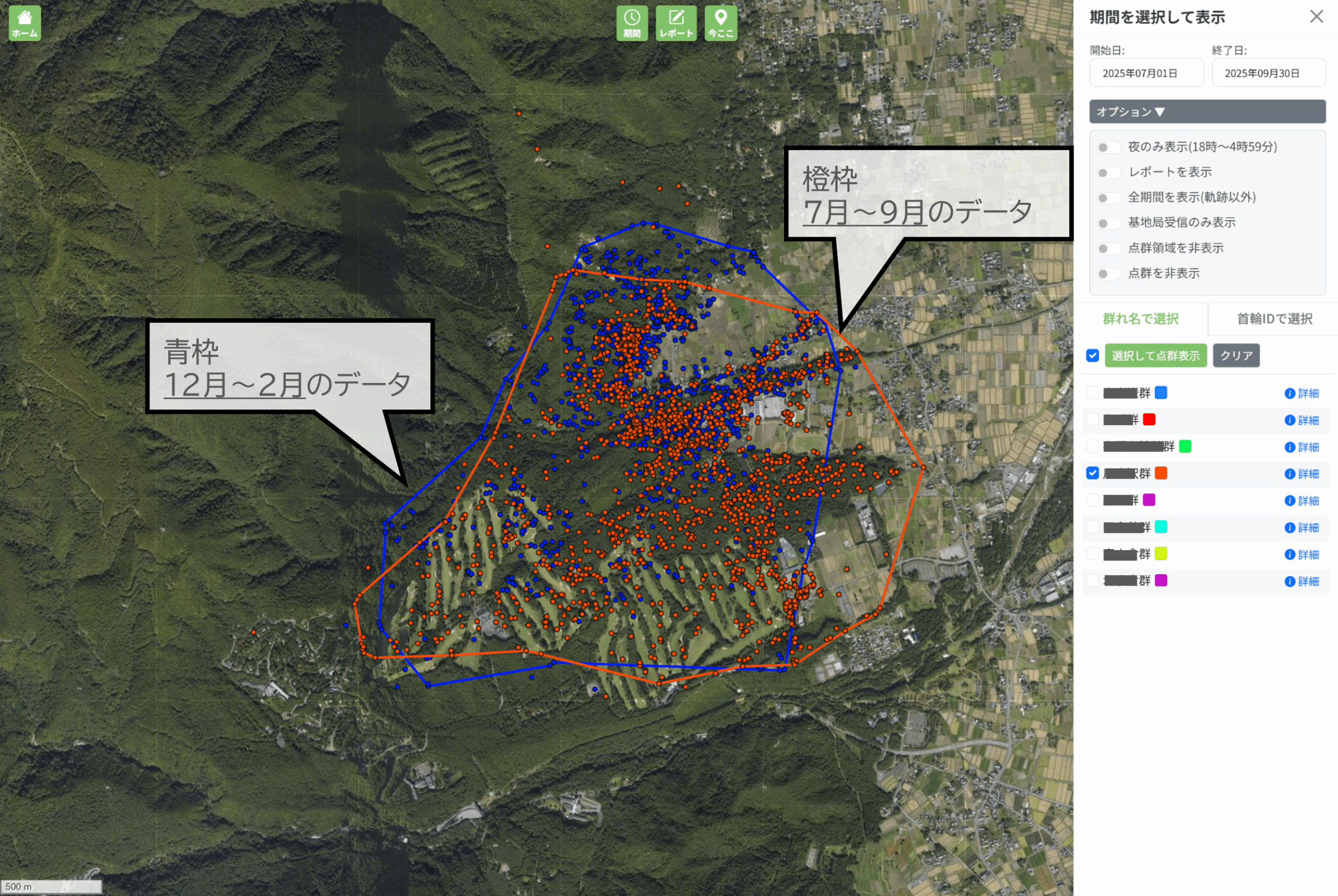 これまで、ログデータをCSV出力し、GISソフトで作成していた図面の一部が、ANIMAL MAP上で作成可能となります。群れごとに色分けして同時に表示できるため、その画面をスクリーンショットすることで、報告用の図面が簡単に作成できます。