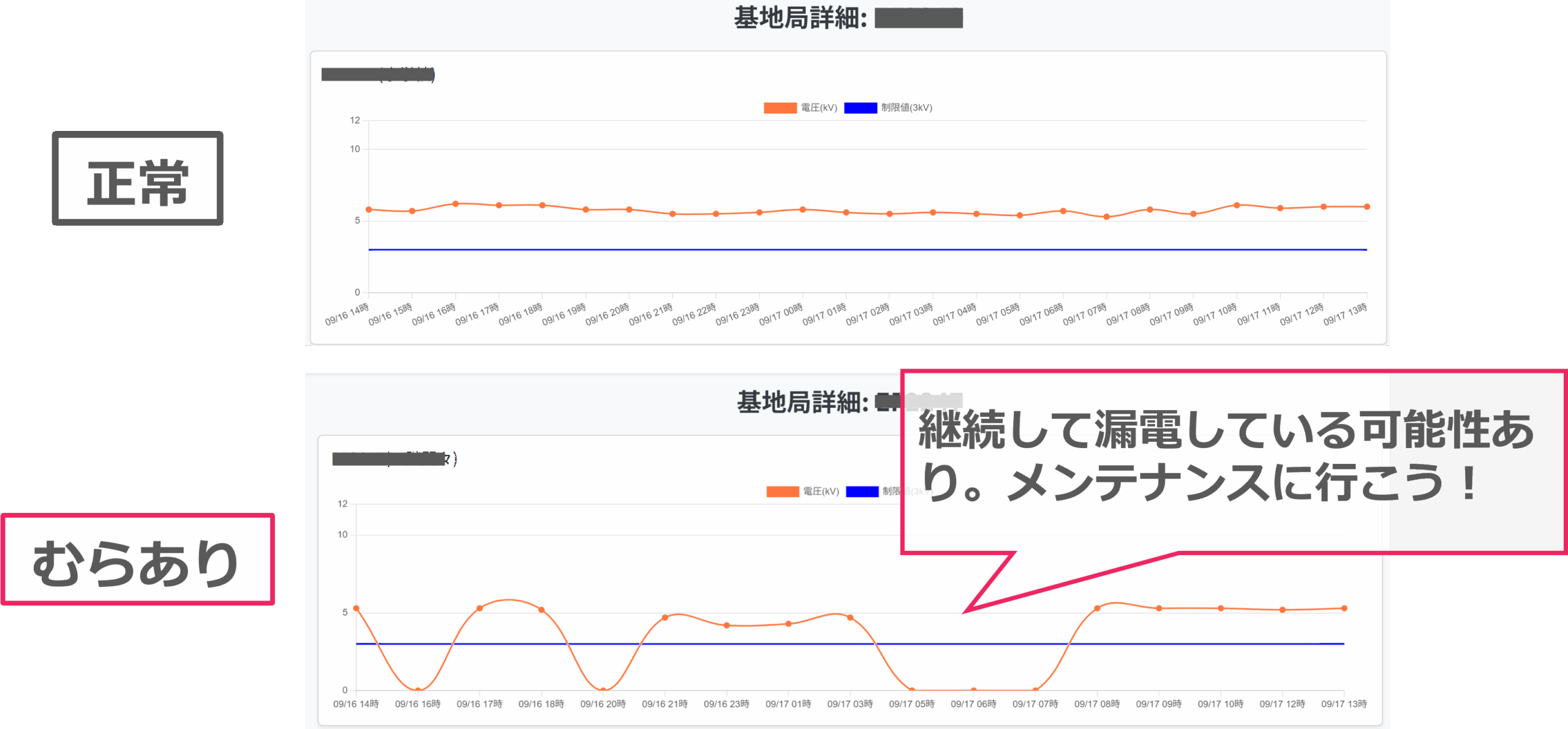 ANIMALMAPの改良版では、電圧の監視システムを導入することで、1時間おきに電圧をチェックすることが可能です。頻繁に電圧が変動している場合、それは草や枝などが柵に接触しているサインかもしれません。このデータに基づき、必要なタイミングで現地を訪れ、草刈りなどのメンテナンスを行う目安となり、効率的な管理に役立ちます。