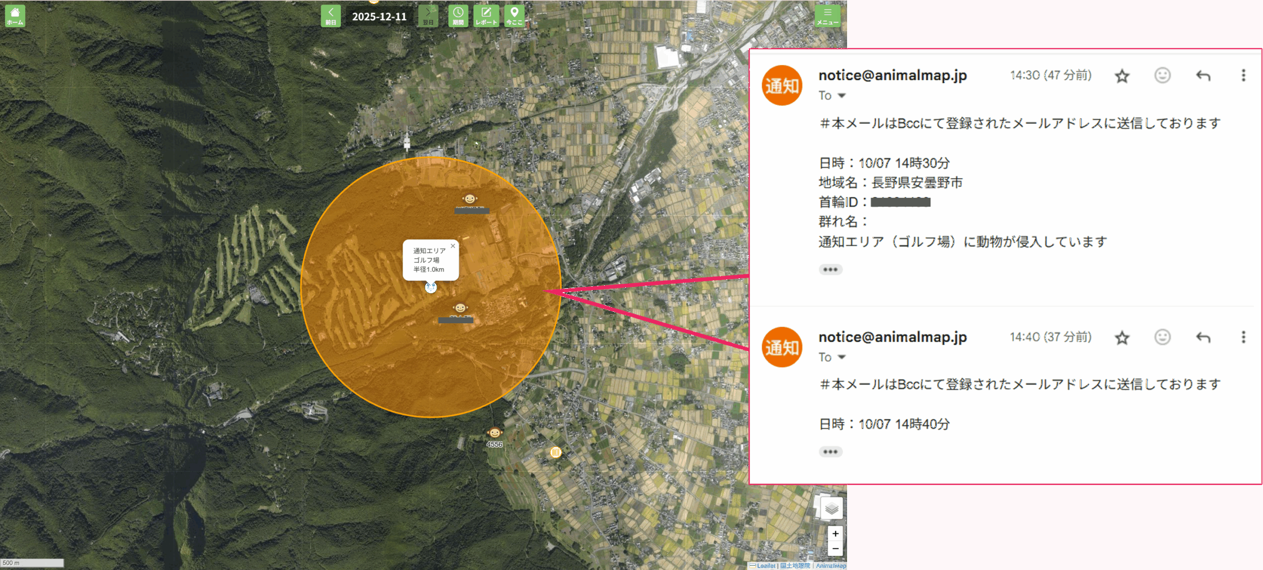 仕組み: 首輪を装着した個体が、GPS測位時にこの設定エリア内にいると、登録されたメールアドレスに自動で通知が届きます。